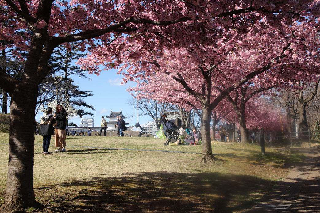城址公園にある桜、城跡に土塁を築き、土塁の両端に櫓があるので城跡らしさが伺える。
